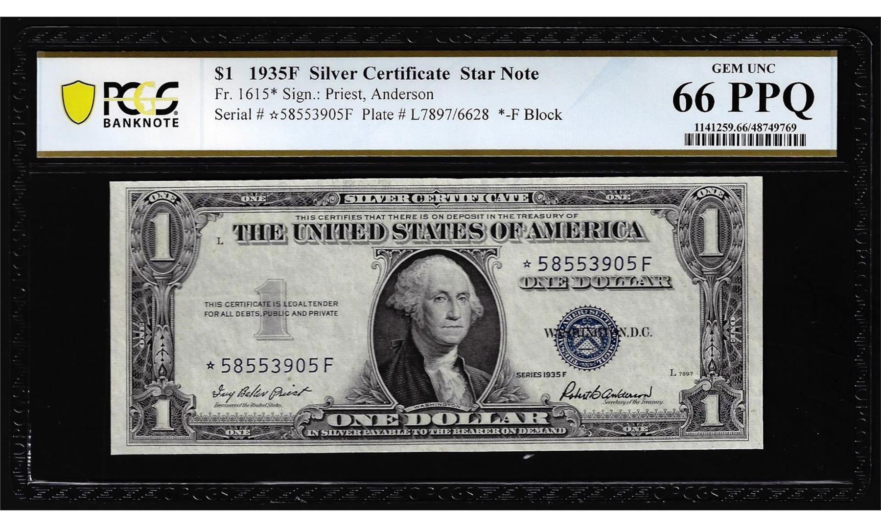 One 1935F $1 Silver Certificate STAR Note Fr.1615* PCGS Gem Uncirculated 66PPQ. PCGS Graded.