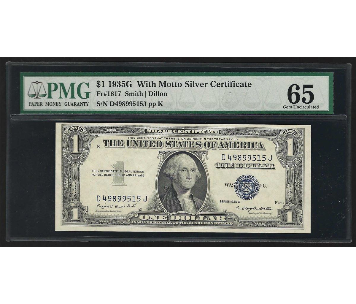 One 1935G $1 with Motto Silver Certificate Note PMG Gem Uncirculated 65. PMG Certified.