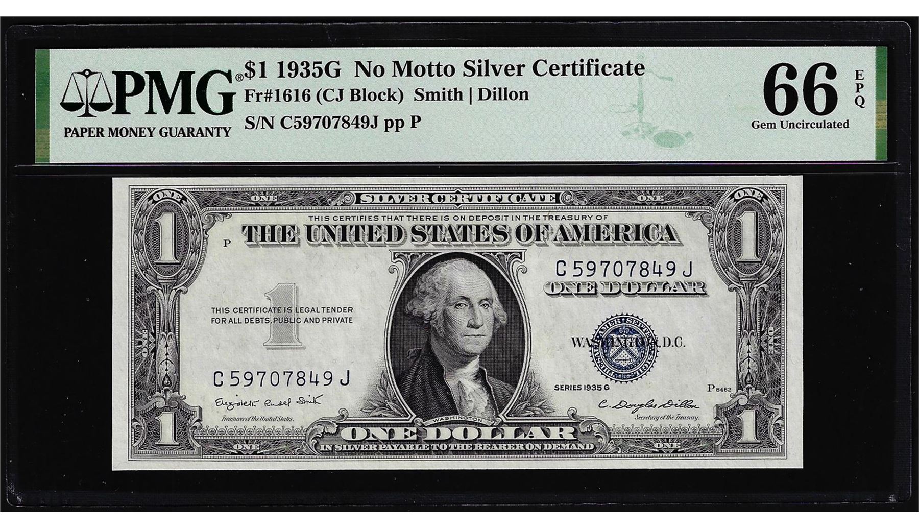 One 1935G No Motto $1 Silver Certificate Note Fr.1616 PMG Gem Uncirculated 66EPQ. PMG Certified.