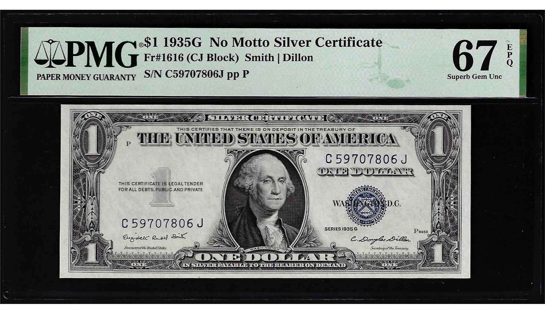 One 1935G No Motto Silver Certificate Note Fr.1616 PMG Superb Gem Uncirculated 67EPQ. PMG Certified.