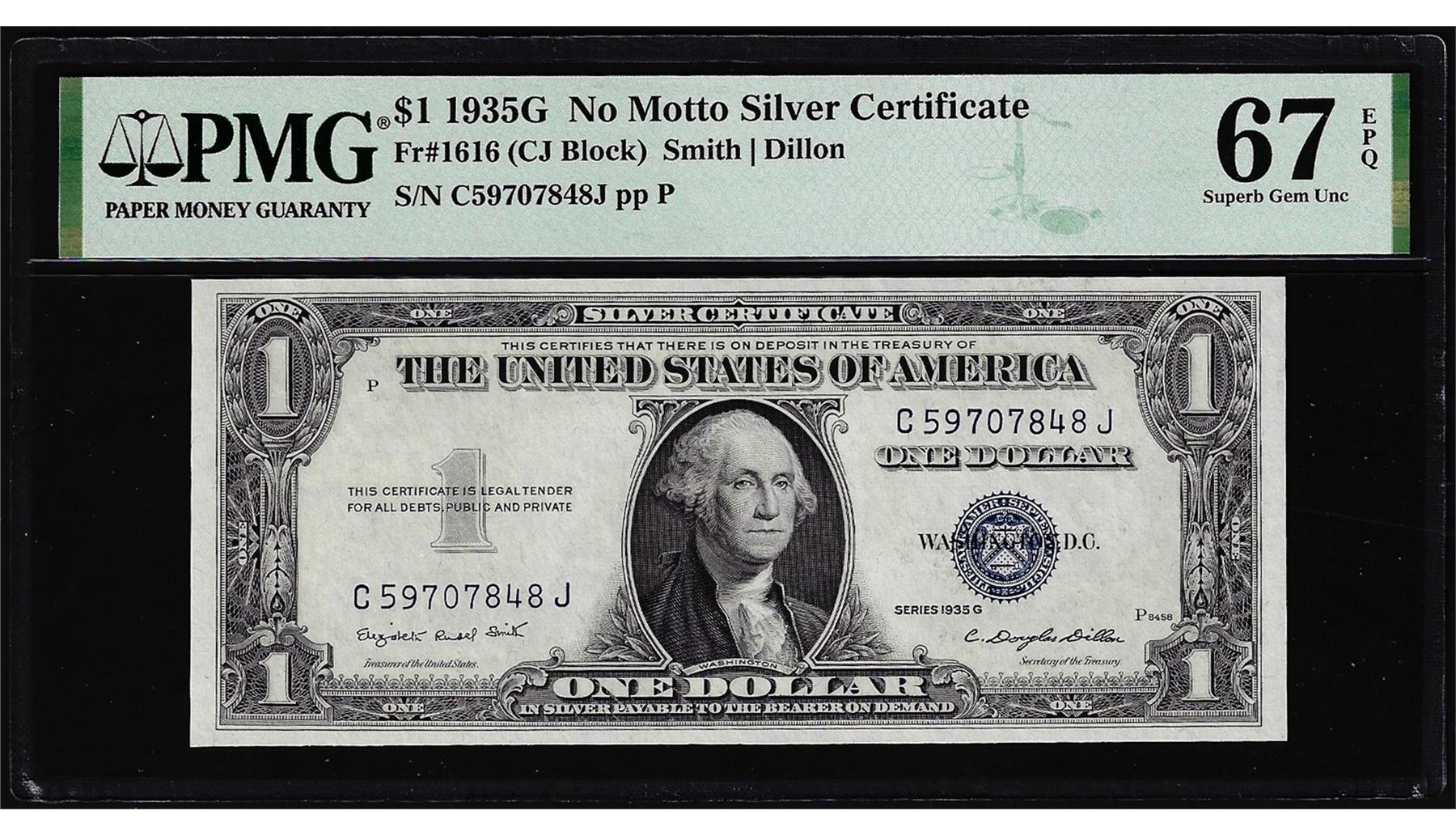 One 1935G No Motto Silver Certificate Note Fr.1616 PMG Superb Gem Uncirculated 67EPQ. PMG Certified.