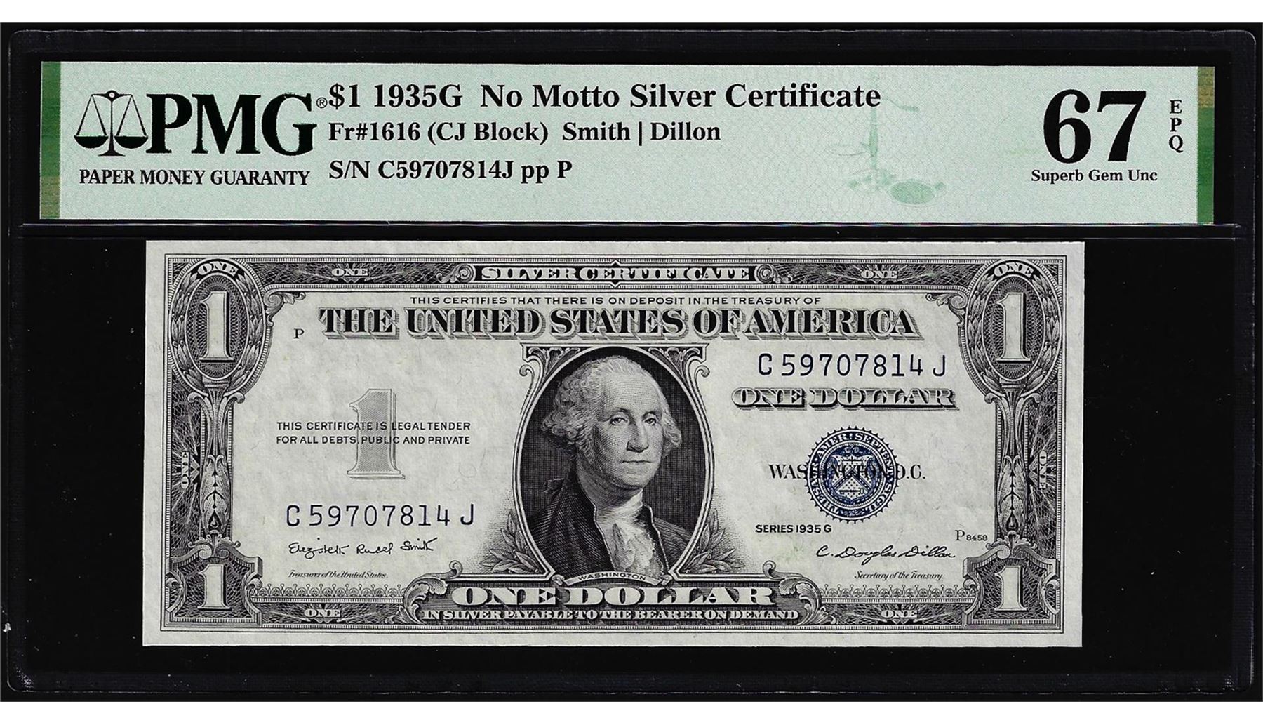 One 1935G No Motto Silver Certificate Note Fr.1616 PMG Superb Gem Uncirculated 67EPQ. PMG Certified.