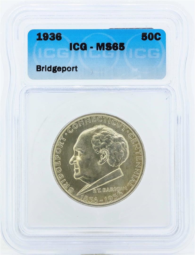 One 1936 Bridgeport Connecticut Centennial Commemorative Half Dollar Coin ICG MS65. ICG Certified.