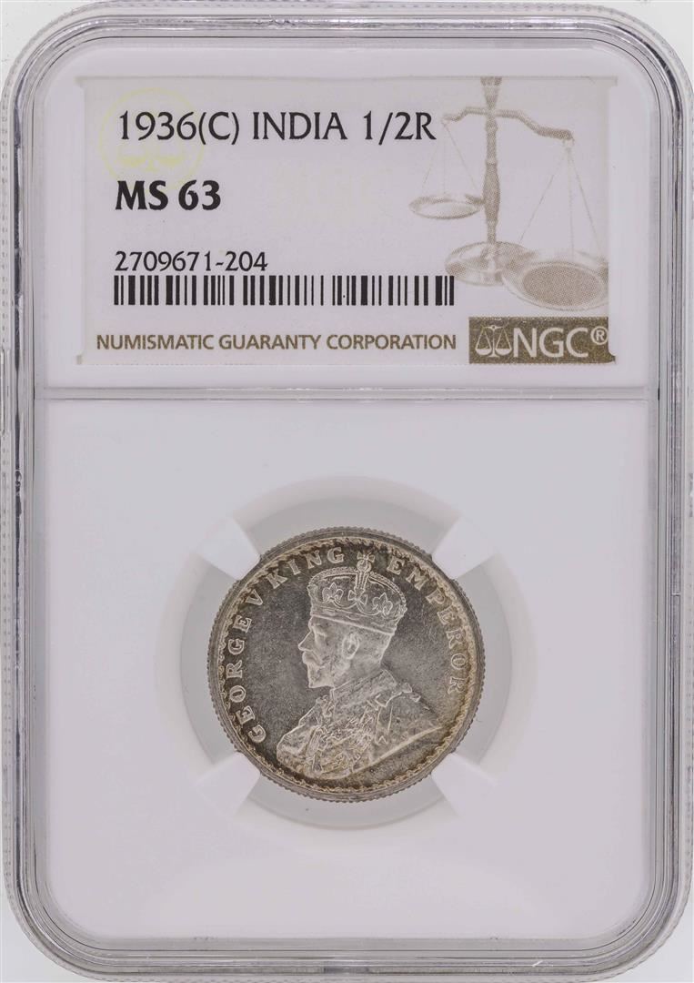One 1936(C) India 1/2 Rupee Coin NGC MS63. NGC Certified.