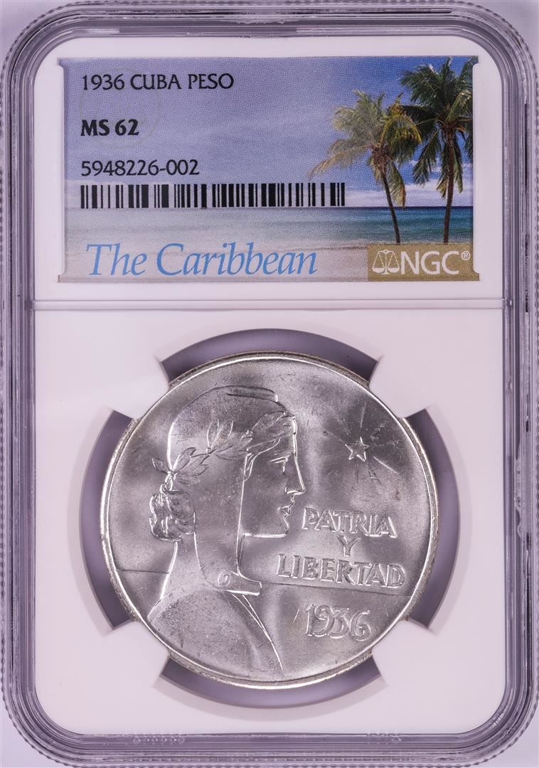 One 1936 Cuba Peso Silver Coin NGC MS62. NGC Certified.