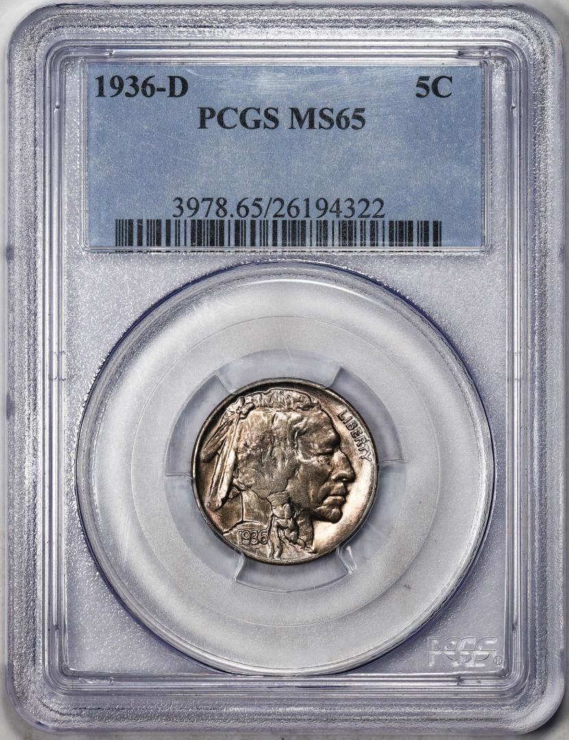 One 1936-D Buffalo Nickel Cent Coin PCGS MS65. PCGS Graded.
