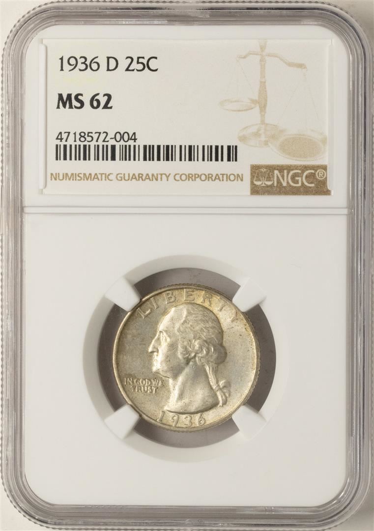 One 1936-D Washington Quarter Coin NGC MS62. NGC Certified.