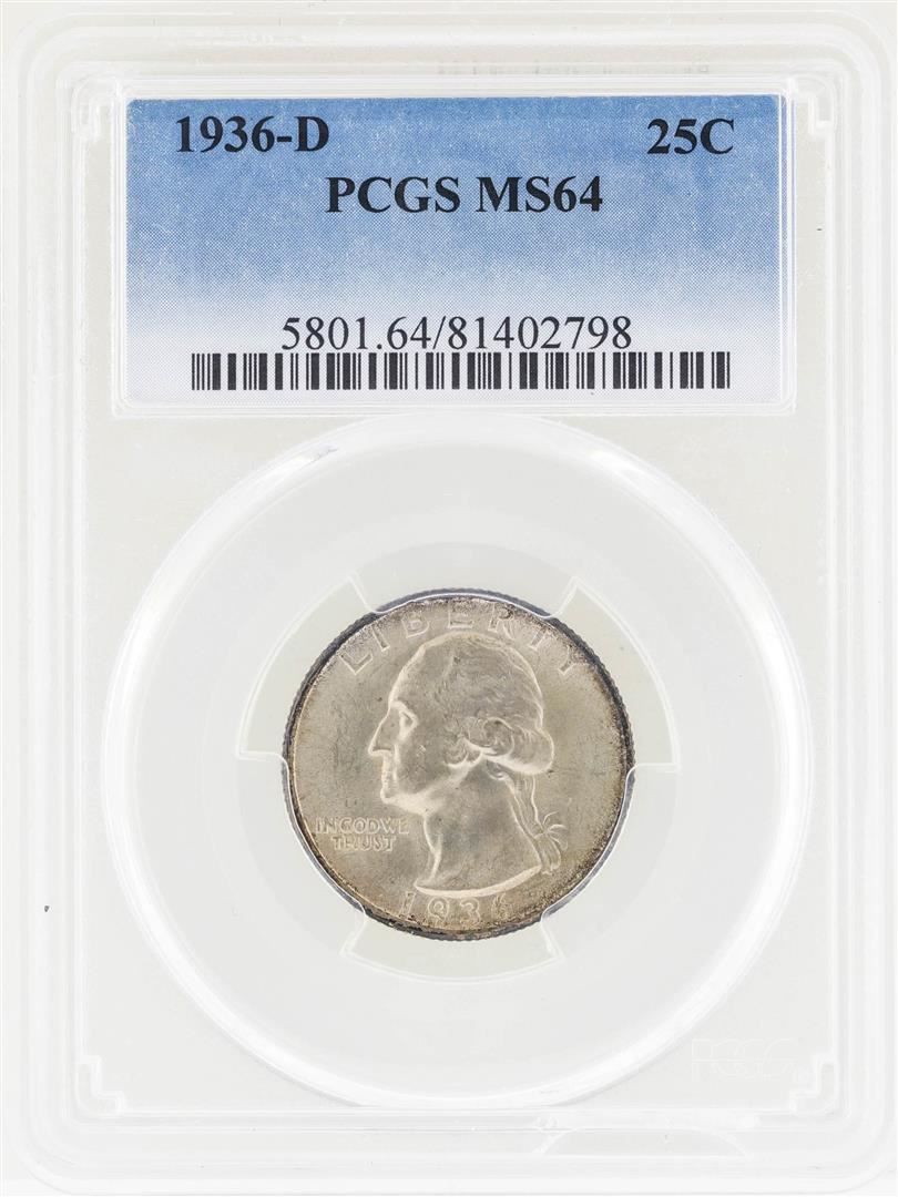 One 1936-D Washington Silver Quarter Coin PCGS MS64. PCGS Graded.