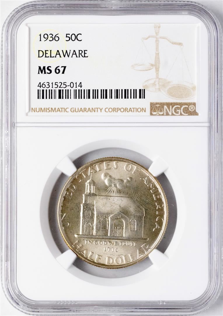 One 1936 Delaware Commemorative Half Dollar Coin NGC MS67. NGC Certified.