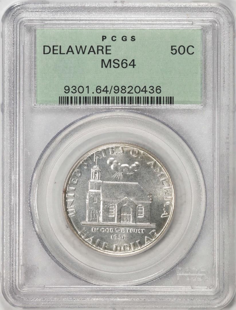 One 1936 Delaware Tercentenary Commemorative Half Dollar Coin PCGS MS64 Old Green Holder. PCGS Graded.