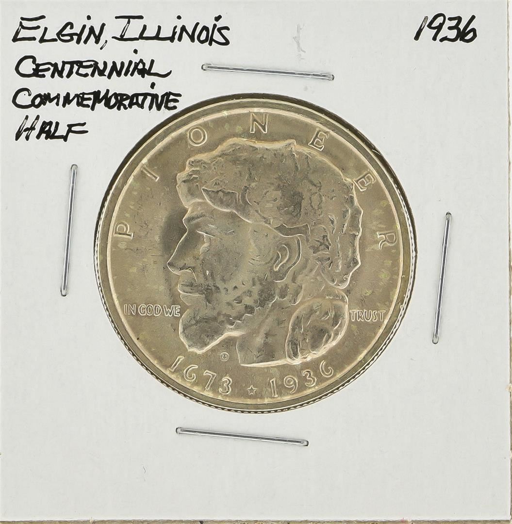 One 1936 Elgin Illinois Centennial Commemorative Half Dollar Coin.