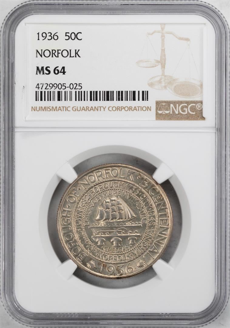 One 1936 Norfolk Bicentennial Commemorative Half Dollar Coin NGC MS64. NGC Certified.