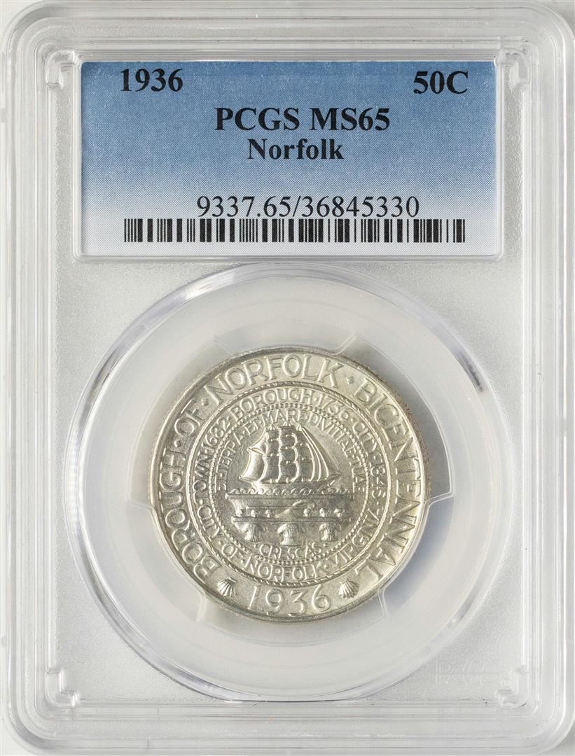 One 1936 Norfolk Bicentennial Commemorative Half Dollar Coin PCGS MS65. PCGS Graded.
