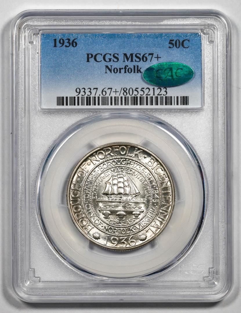 One 1936 Norfolk Bicentennial Commemorative Half Dollar Coin PCGS MS67+ CAC. PCGS Graded.