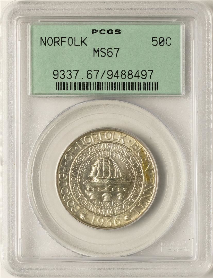 One 1936 Norfolk Bicentennial Commemorative Half Dollar Coin PCGS MS67 Old Green Holder. PCGS Graded.