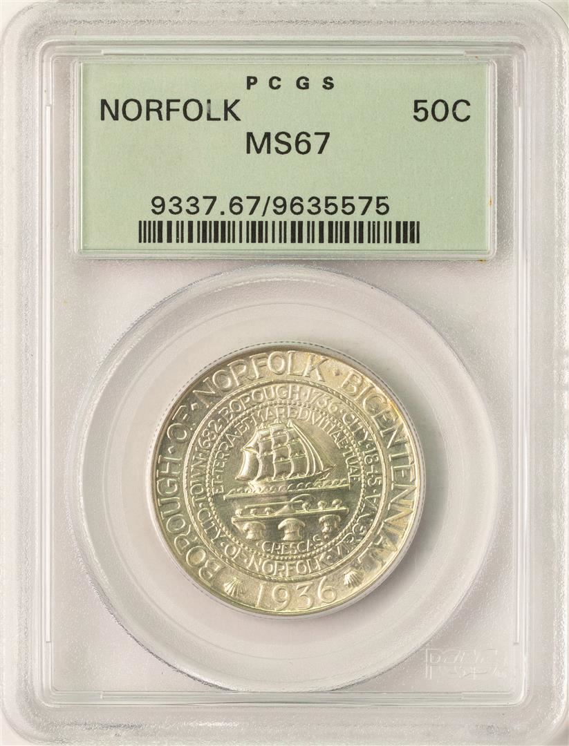 One 1936 Norfolk Bicentennial Commemorative Half Dollar Coin PCGS MS67 Old Green Holder. PCGS Graded.