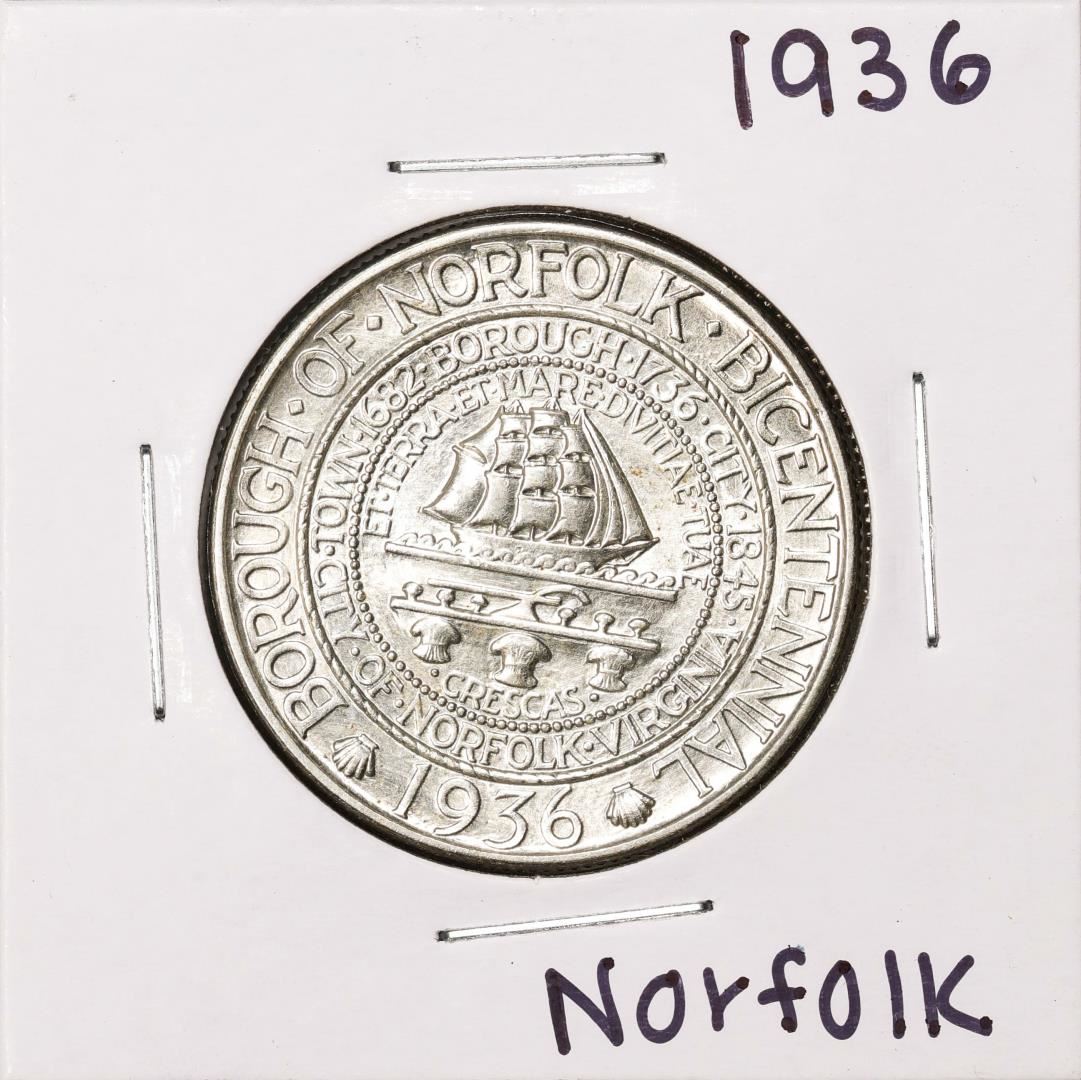One 1936 Norfolk Bicentennial Commemorative Half Dollar Coin.