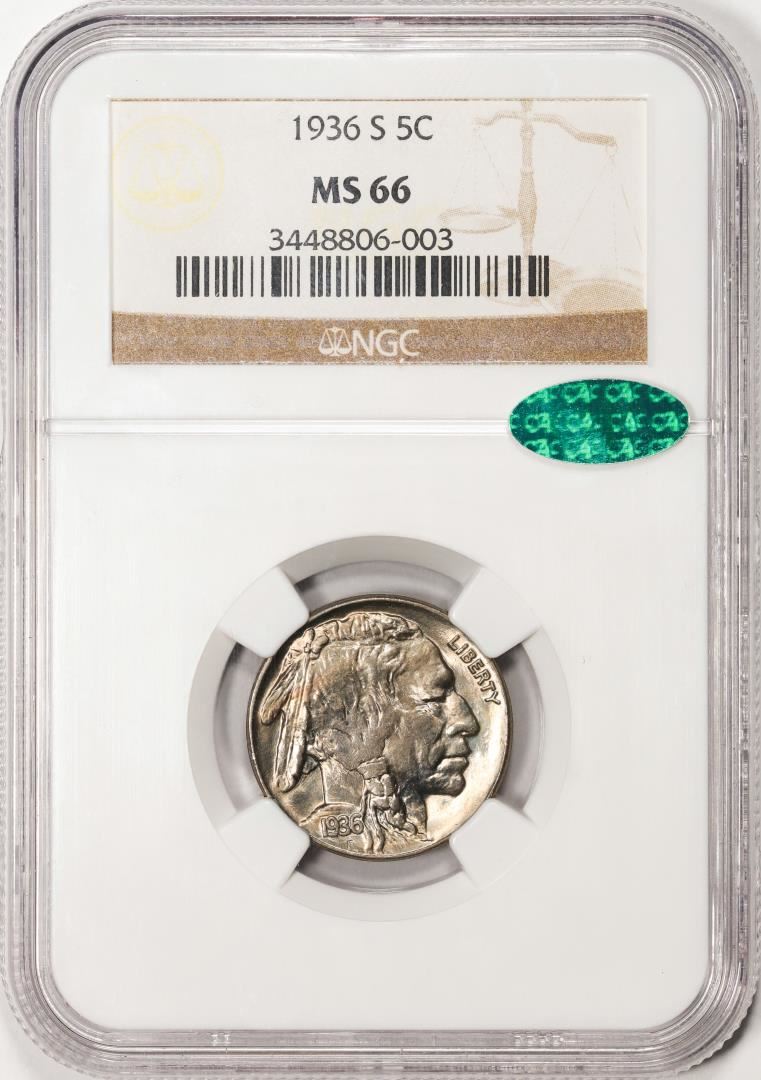 One 1936-S Buffalo Nickel Coin NGC MS66 CAC. NGC Certified.
