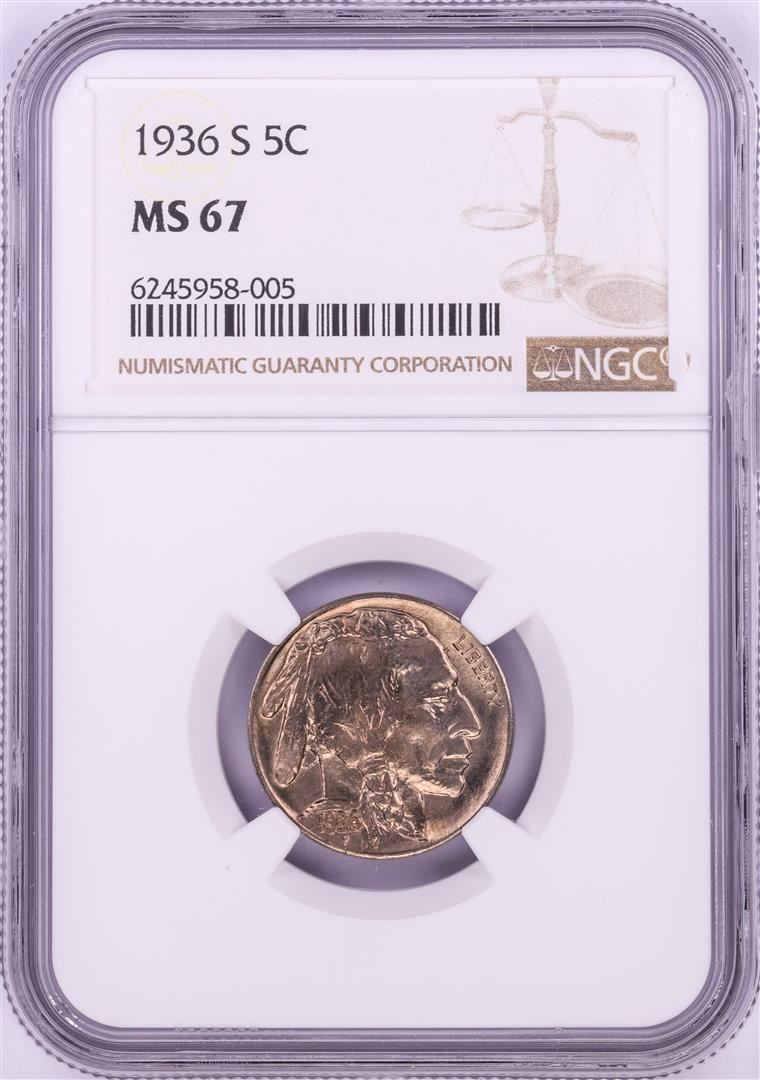 One 1936-S Buffalo Nickel Coin NGC MS67. NGC Certified.