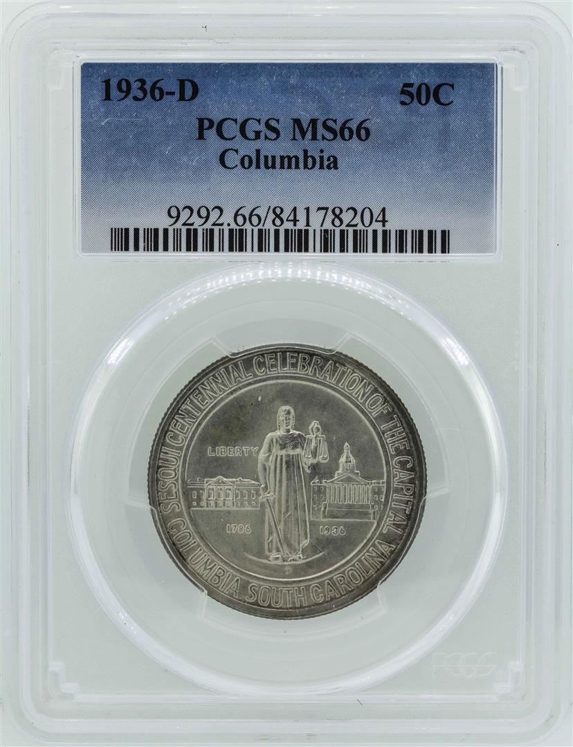One 1936-S Columbia South Carolina Sesquicentennial Commemorative Half Dollar Coin PCGS MS66. PCGS Graded.