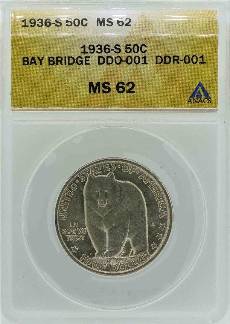 One 1936-S San Francisco - Oakland Bay Bridge Commemorative Half Dollar Coin ANACS MS62. ANACS Certified.