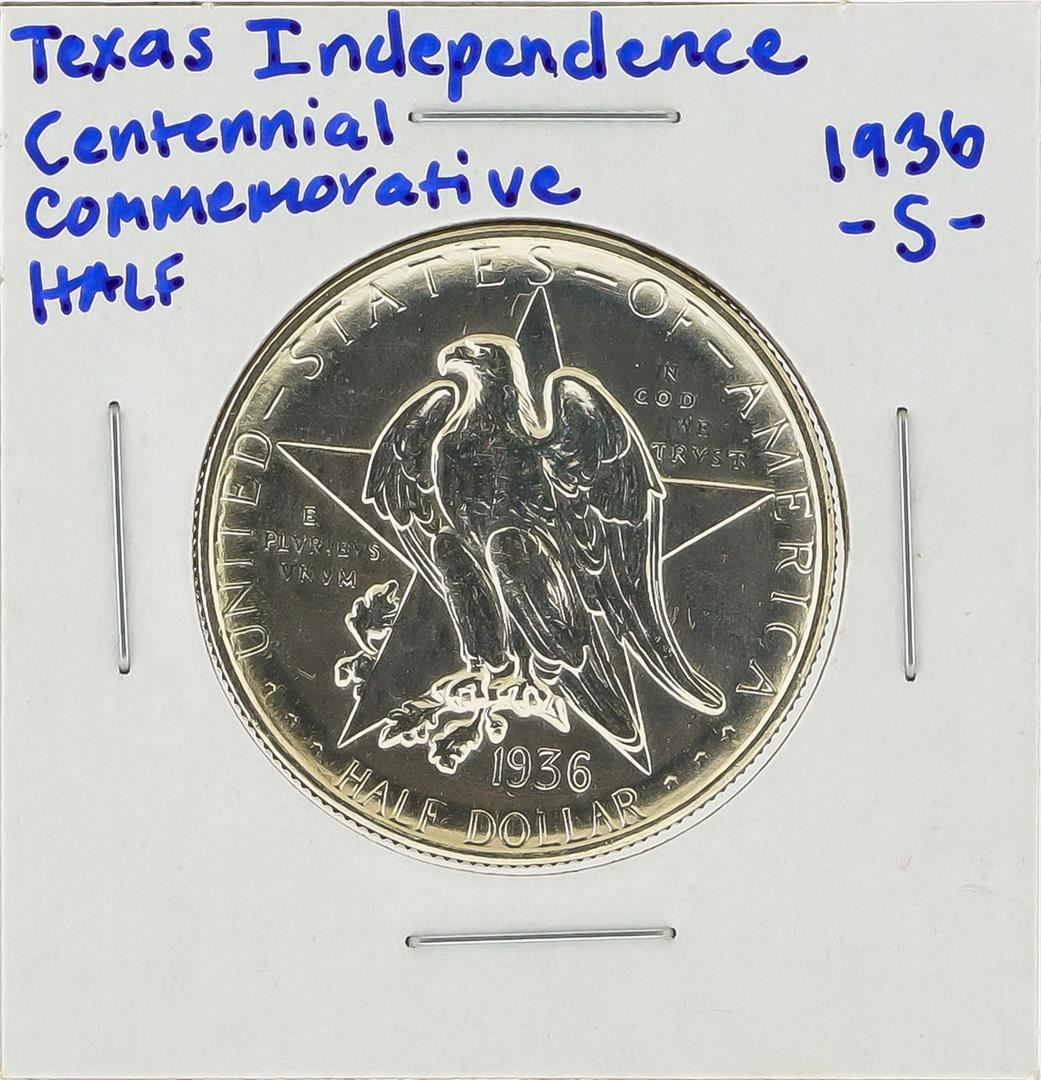 One 1936-S Texas Independence Centennial Commemorative Half Dollar Coin.