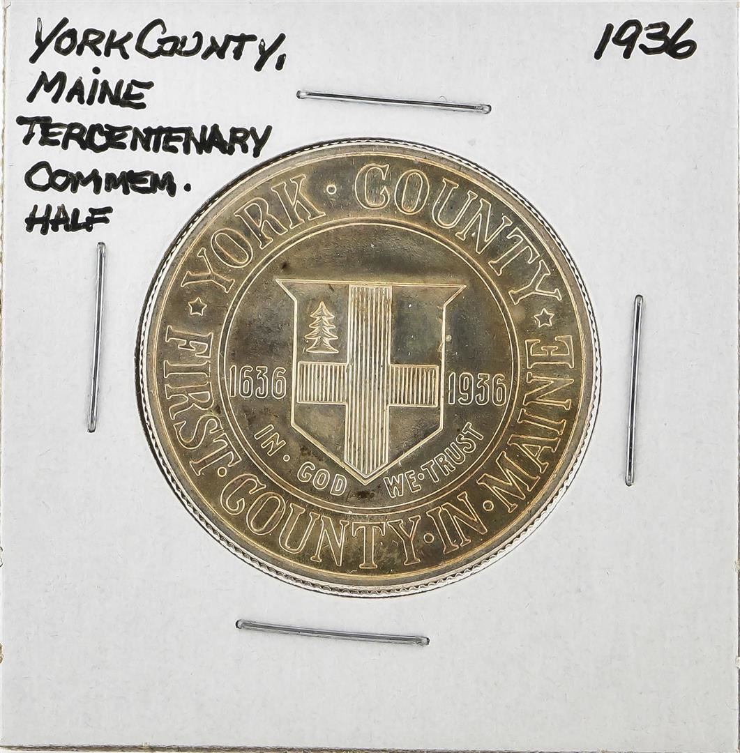 One 1936 York County, Maine Tercentenary Commemorative Half Dollar Coin.