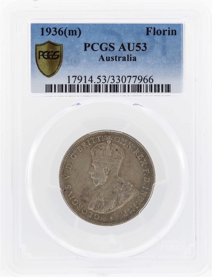 One 1936(m) Australia Florin Silver Coin PCGS AU53. PCGS Graded.