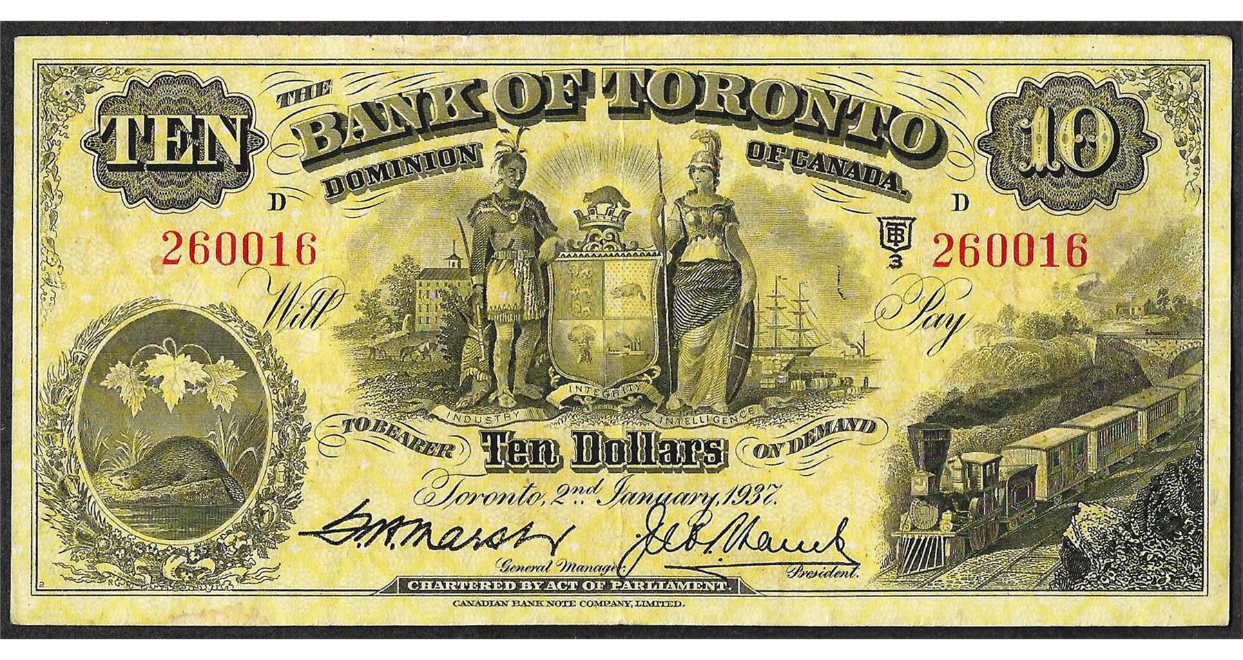 One 1937 $10 Bank of Toronto Canada Note.