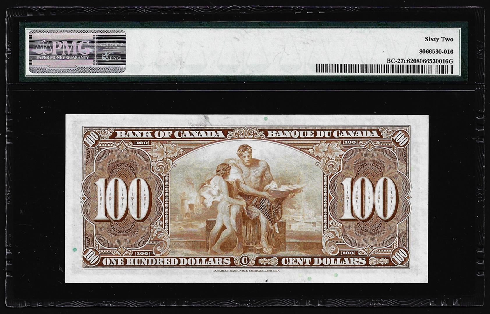 One 1937 $100 Bank of Canada Note BC-27c PMG Uncirculated 62. PMG Certified.