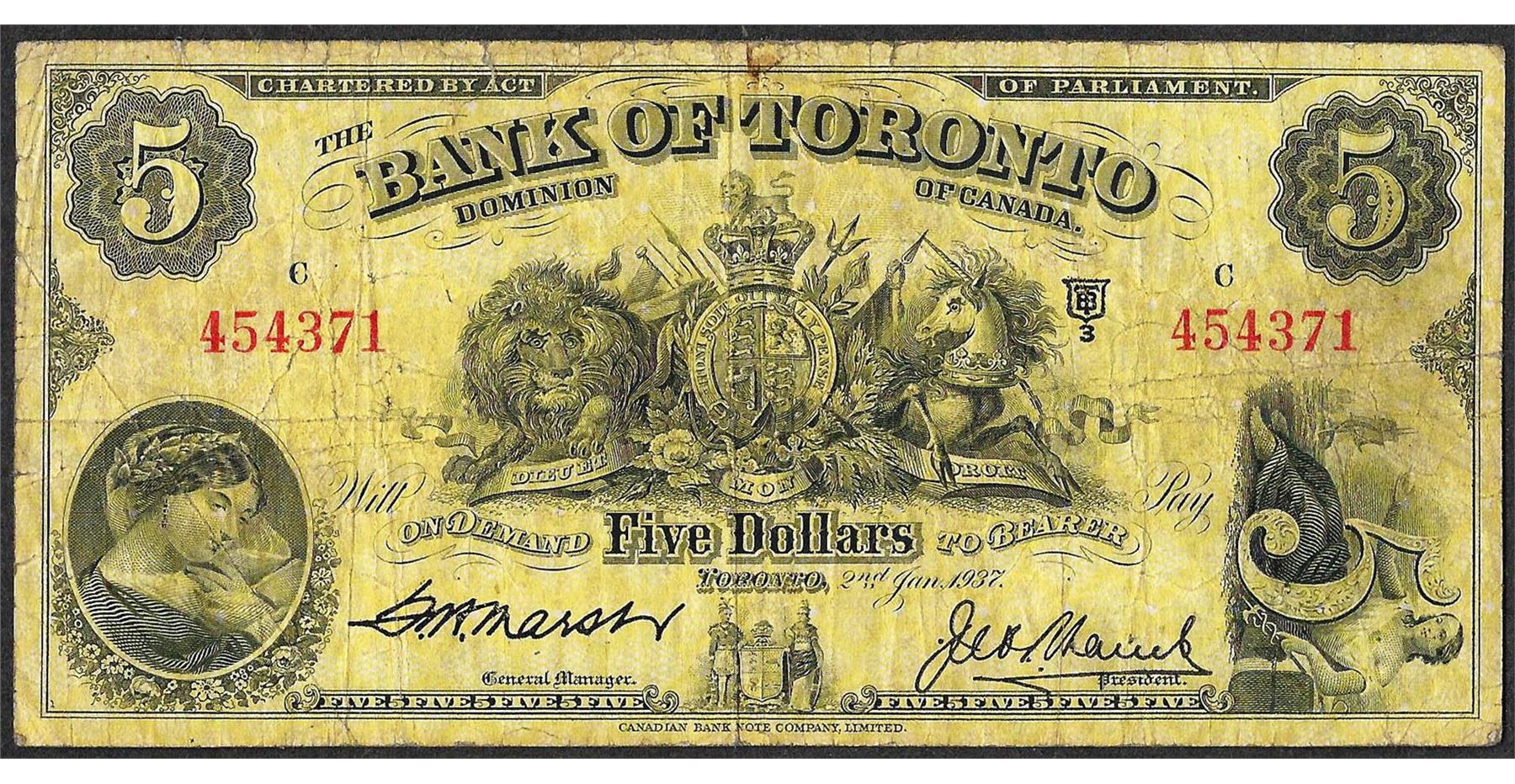 One 1937 $5 Bank of Toronto Canada Note.
