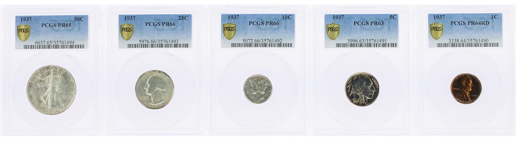 One 1937 (5) Coin Proof Set PCGS Graded PR63/PR64/PR65/PR66. PCGS Graded.