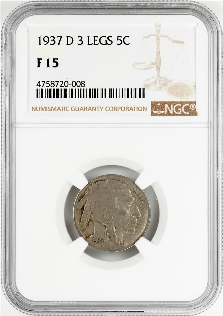 One 1937-D 3 Legged Buffalo Nickel Coin NGC F15. NGC Certified.