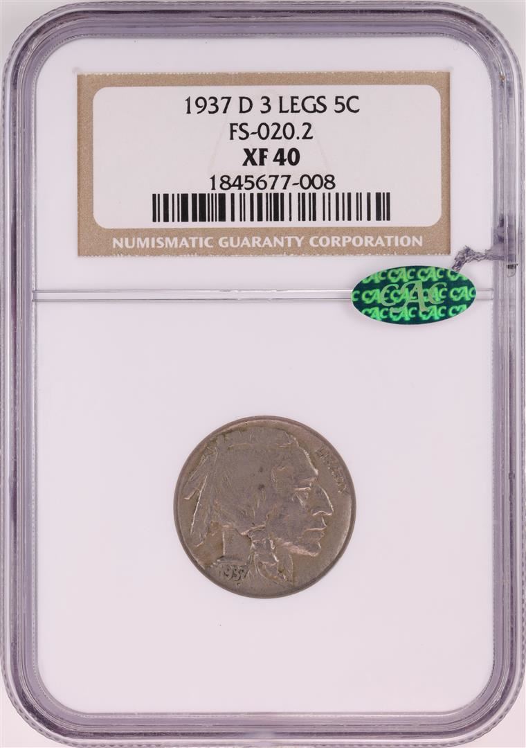 1937-D 3 Legs Buffalo Nickel Coin NGC XF40 CAC FS-020.2