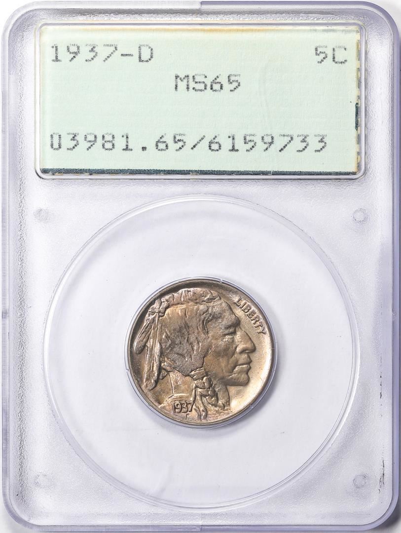 One 1937-D Buffalo Nickel Coin PCGS MS65 Old Green Rattler. PCGS Graded.