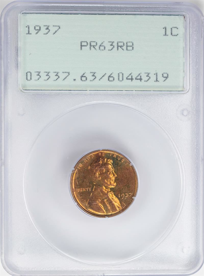 One 1937 Proof Lincoln Wheat Cent Coin PCGS PR63RB Old Green Rattler. PCGS Graded.