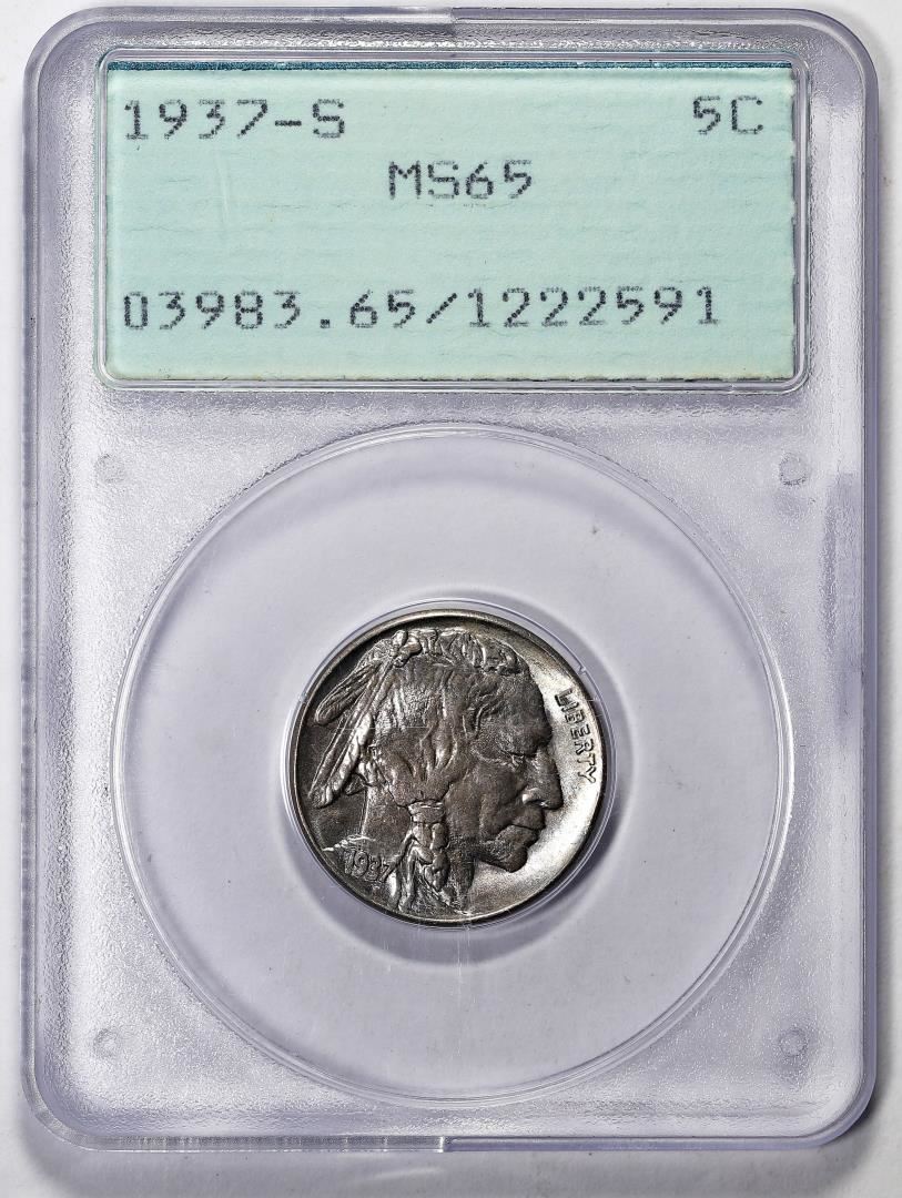 One 1937-S Buffalo Nickel Coin PCGS MS65 Old Green Rattler. PCGS Graded.