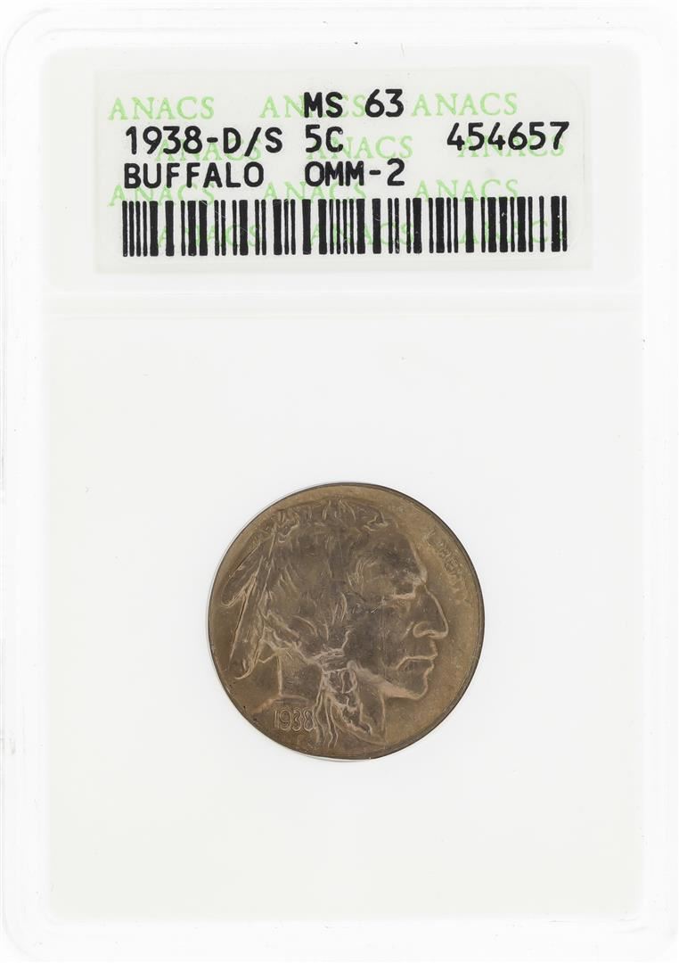 One 1938-D/S Buffalo Nickel Coin ANACS MS63. ANACS Certified.
