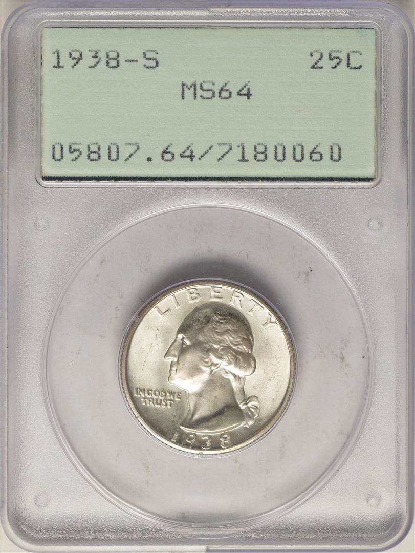 1938-S Washington Quarter Coin PCGS MS64 Old Green Rattler Holder