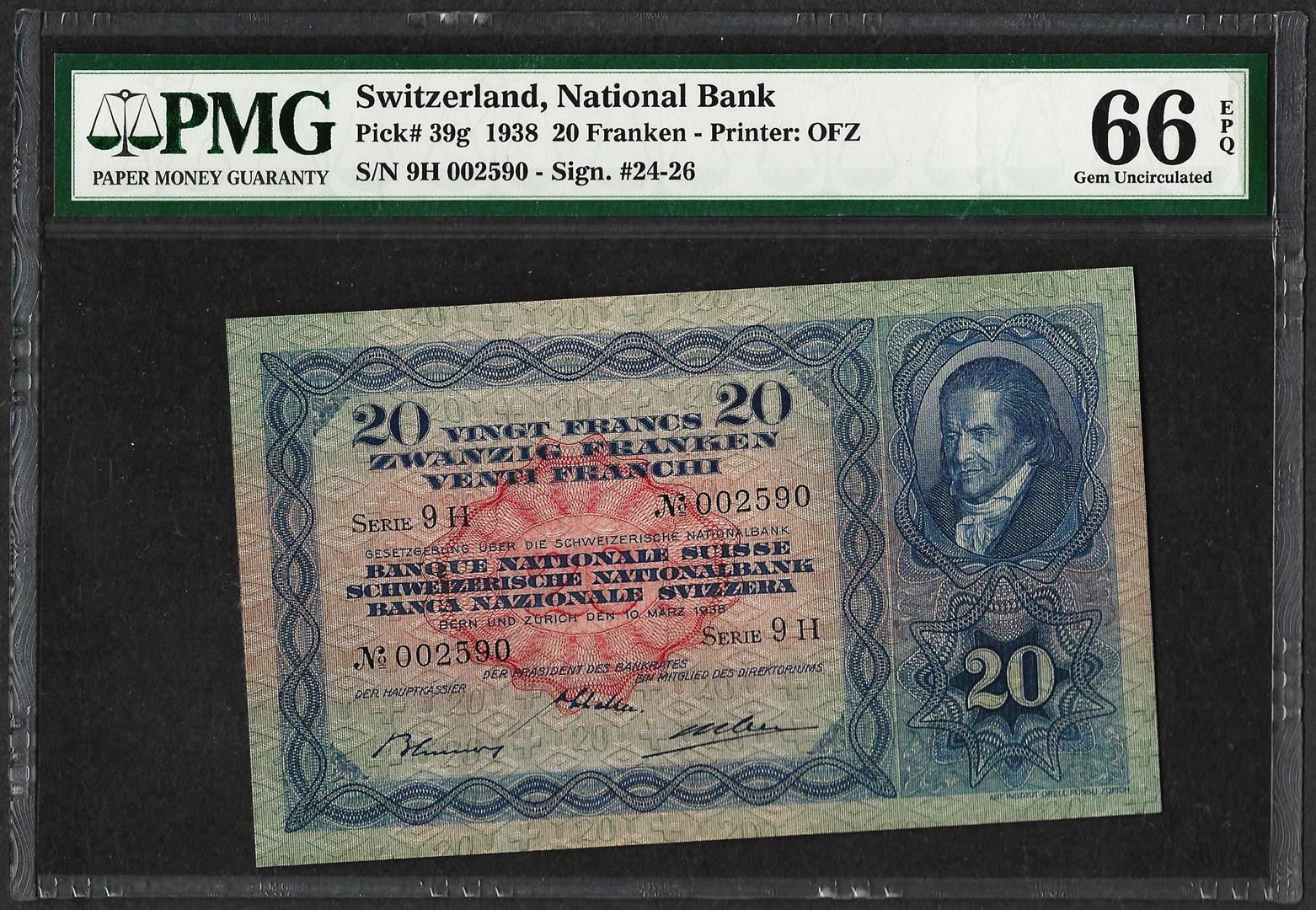 One 1938 Switzerland 20 Franken National Bank Note Pick #39g PMG Gem Uncirculated 66EPQ. PMG Certified.