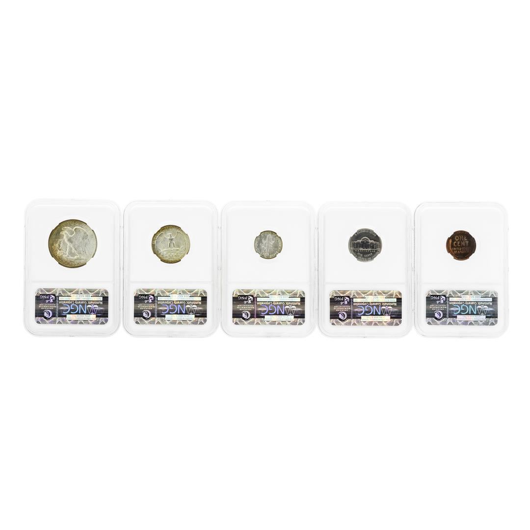 One 1939 (5) Coin Proof Set NGC PF64/65. This set includes the following coins: 1939 Lincoln Wheat Penny Proof NGC PF64RB, 1939 Reverse of 38 Jefferson Nickel Proof NGC PF65, 1939 Mercury Dime NGC PF64, 1939 Washington Quarter NGC PF65, 1939 Walking Liberty Half Dollar NGC PF65. NGC Certified.