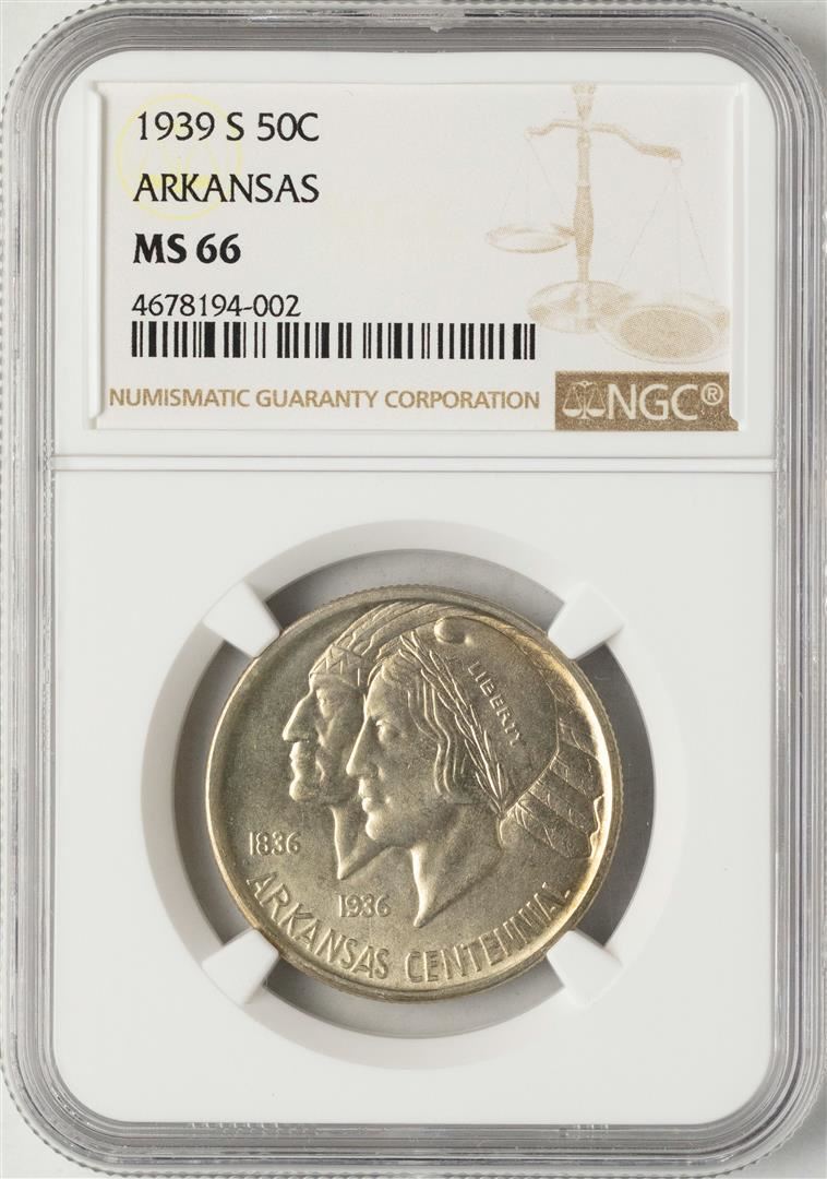 One 1939-S Arkansas Centennial Commemorative Half Dollar Coin NGC MS66. NGC Certified.