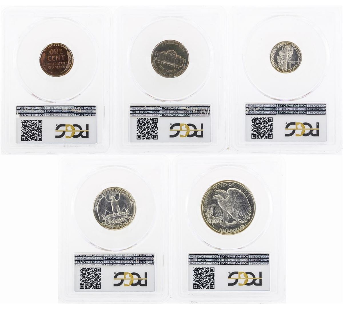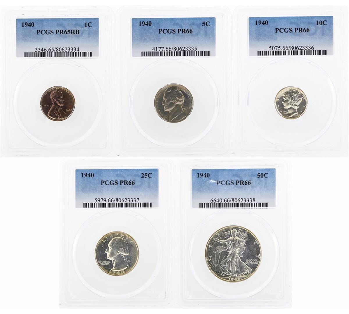One 1940 (5) Coin Proof Set PCGS Graded PR65 & PR66. This set includes (1) 1940 Proof Lincoln Wheat Penny PCGS PR65RB, (1) 1940 Proof Jefferson Nickel PCGS PR66, (1) 1940 Proof Mercury Dime PCGS PR66, (1) 1940 Proof Washington Quarter PCGS PR66, and (1) 1940 Proof Walking Liberty Half Dollar PCGS PR66. PCGS Graded.