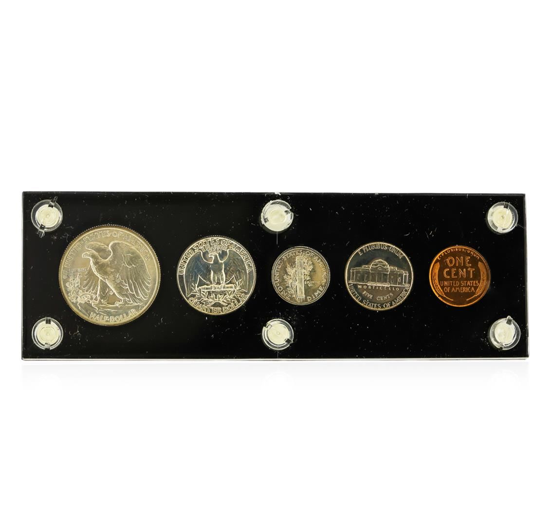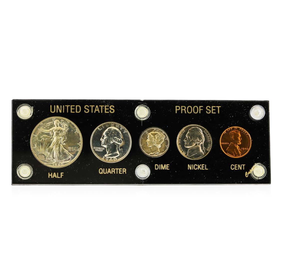 This 1940 (5) Coin Proof Set includes the following coins: 1940 Walking Liberty Half Dollar, 1940 Washington Quarter, 1940 Mercury Dime, 1940 Jefferson Nickel, and a 1940 Lincoln Wheat Cent.