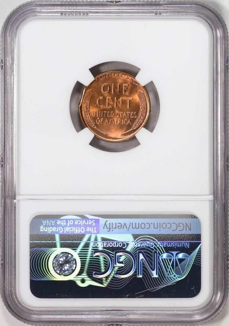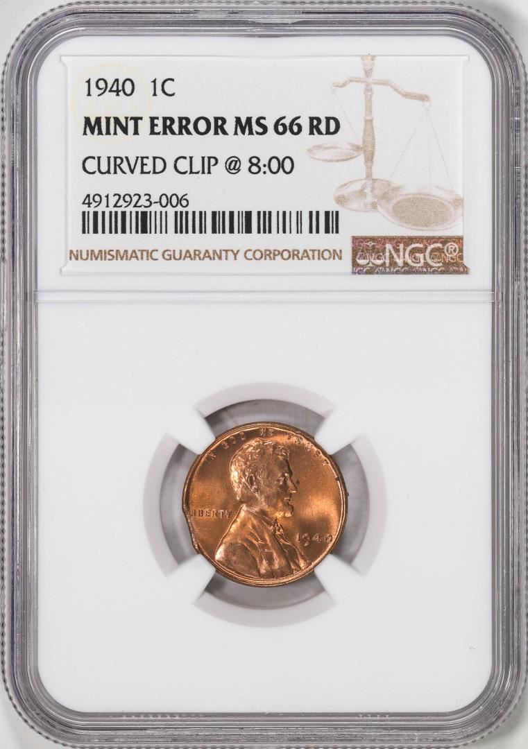 One 1940 Lincoln Wheat Cent Coin Mint Error Curved Clip @ 8:00 NGC MS66RD. NGC Certified.