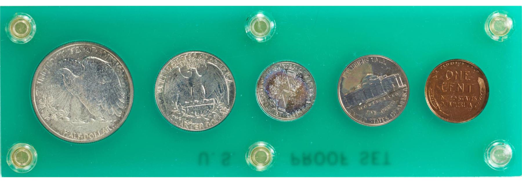 Bidders are advised that certain types of plastic may react with a coin's metal or transfer plasticizer to notes and may cause damage. Caution should be used to avoid storage in materials that are not inert.