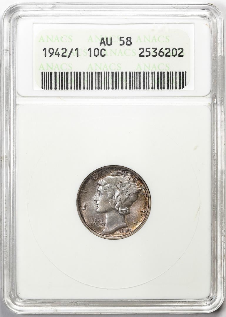 One 1942/1 Mercury Dime Coin ANACS AU58 Old Soap Box Holder. ANACS Certified.