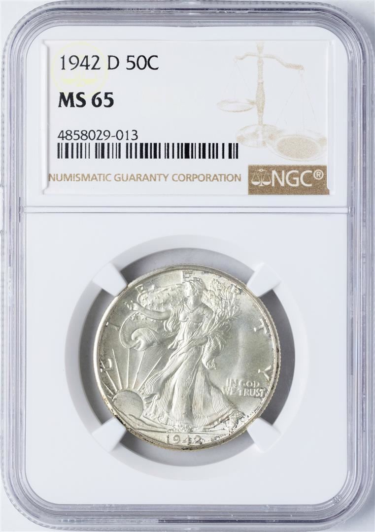 One 1942-D Walking Liberty Half Dollar Coin NGC MS65. NGC Certified.