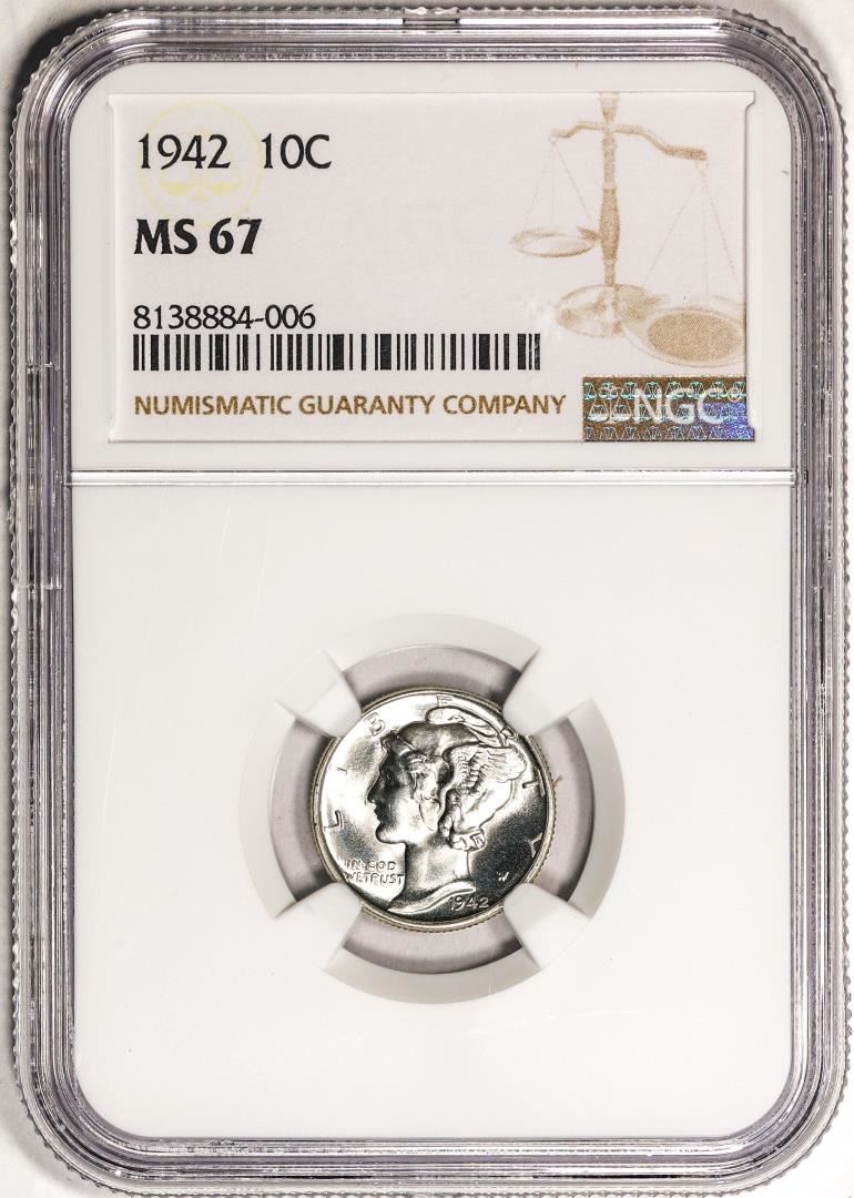 One 1942 Mercury Dime Coin NGC MS67. NGC Certified.