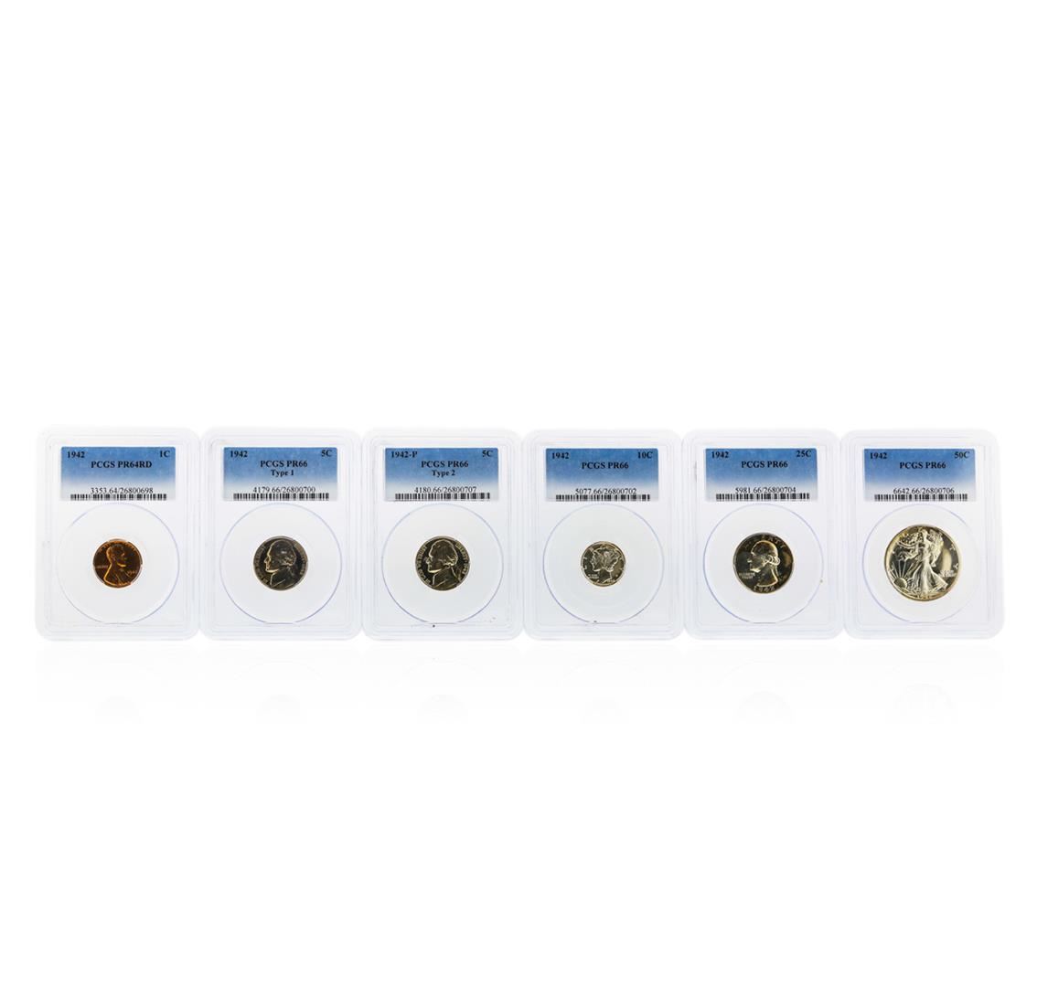 This 1942 PCGS Graded (6) Coin Proof Set includes the following coins: 1942 Lincoln Cent PCGS Graded PR64RD coin, 1942 Jefferson Nickel PCGS Graded PR66 Type 1, 1942-P Jefferson Nickel PCGS Graded PR66 Type 2, 1942 Mercury Dime PCGS Graded PR66, 1942 Wash PCGS Graded.